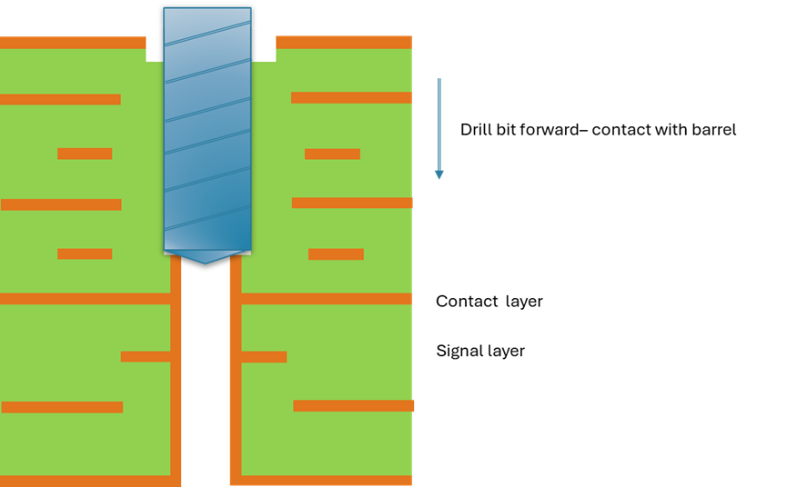 Set the drill depth up to remove the hole barrel above the Must Cut layer. This is a rough set-up but as close to the must cut layer. At this stage the drill bit is making contact with the outside copper over the plating.