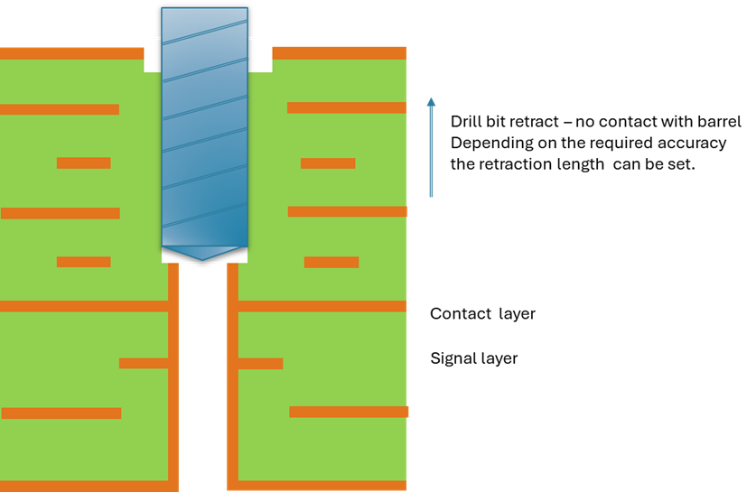 The drill bit can now remove the smaller remainder of the barrel close to the signal layer. The tolerances in the dielectrics are smaller and therefore the distance to the signal layer can be set smaller as the risk of cutting the signal layer is smaller.