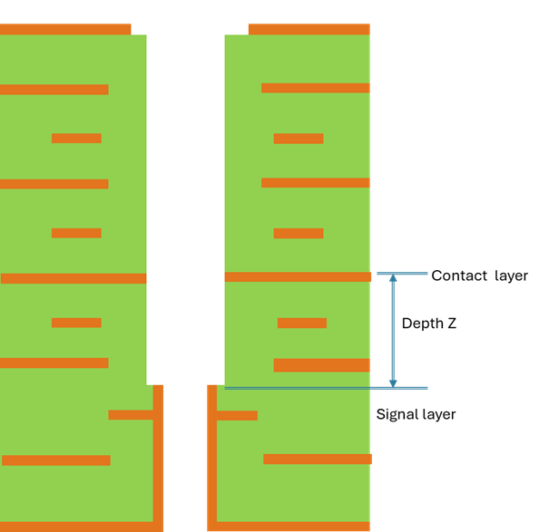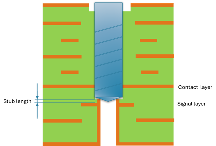 The dielectric spacing between Contact and Signal layer in the example is for most high speed products about 0,3mm. The depth setting Z could be 0,2mm yielding a stub of 0,1mm.
